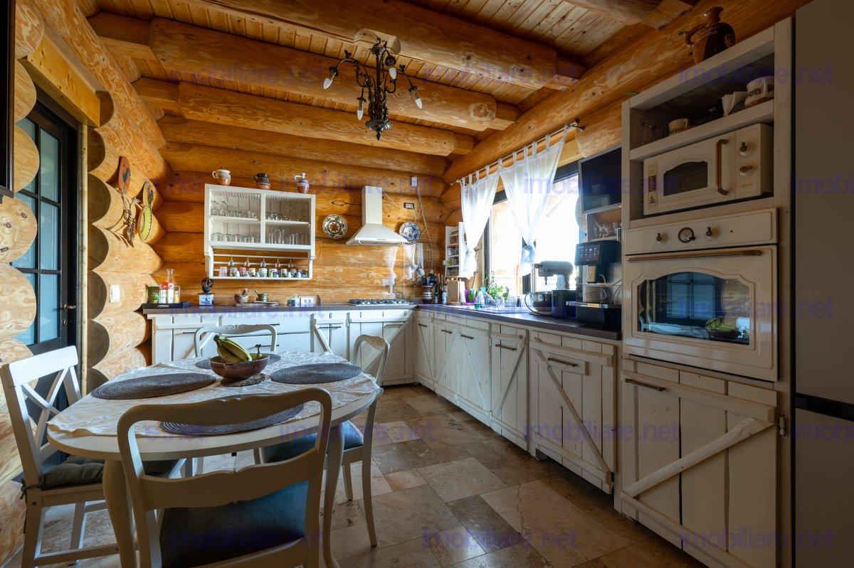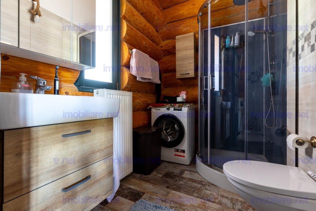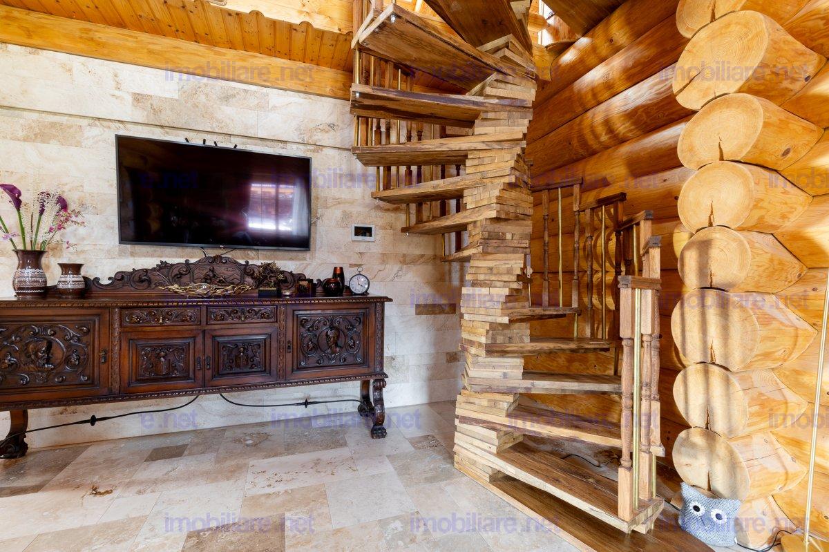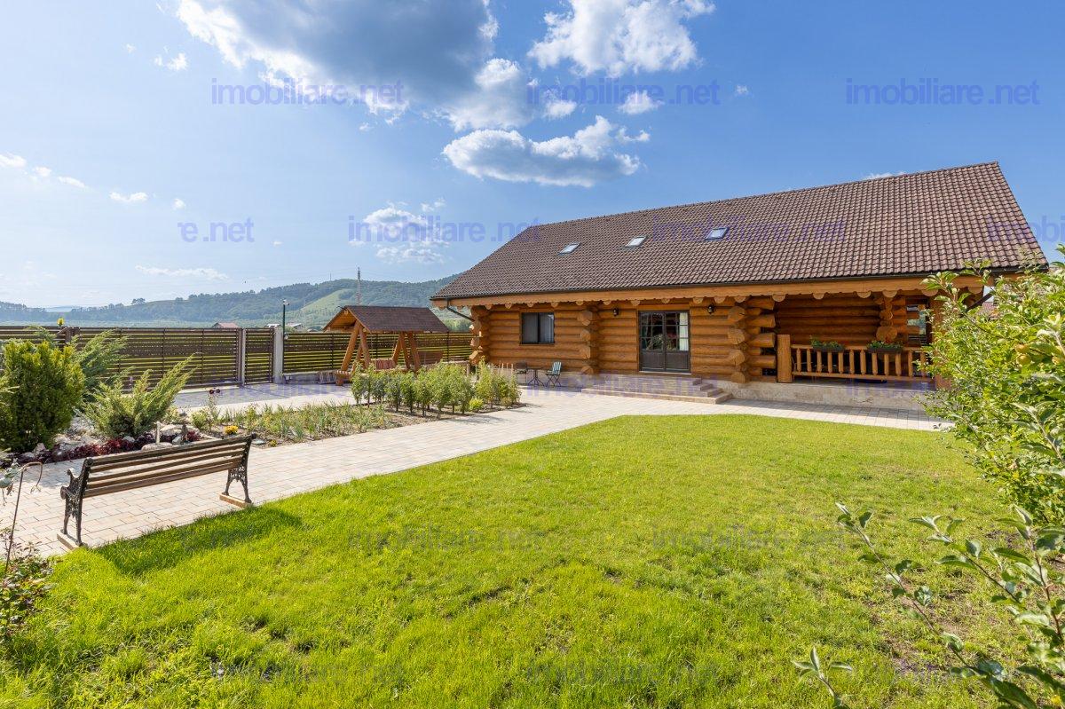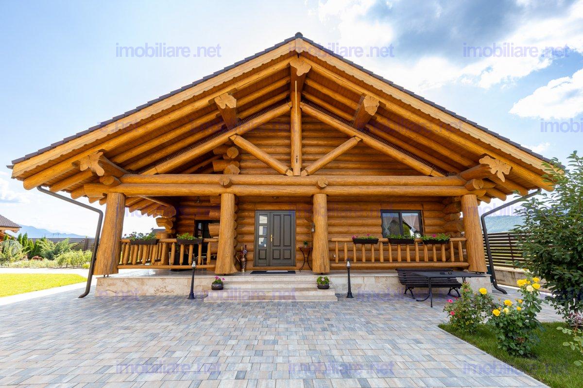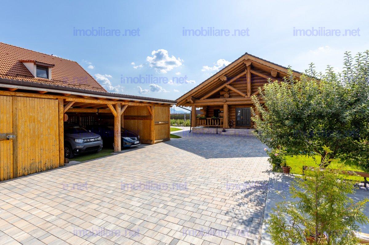 Refugiu canadian din lemn masiv – oaza premium la 10 min de Brașov Imaginați-vă cum ar fi să vă treziți în mirosul cald al lemnului natural, cu panorama Munților Ciucaș pe fundal și întreaga curte scăldată în soare. În Hărman, la doar câteva minute de agitația orașului Brașov, vă așteaptă o proprietate spectaculoasă, creată pentru cei care nu acceptă compromisuri; De ce această casă este unică • Construcție canadiană din lemn masiv – eficiență energetică superioară, aer sănătos și o estetică inconfundabilă. • Travertin natural pe fațadă, soclu și în toate zonele interioare traficate, pentru un look de revistă care rezistă în timp. • Suprafață totală teren 1.200 m² – grădină matură, curte pavată, terase generoase și două accese auto independente cu porți automatizate. • 314 m² construiți (354 m² utili) împărțiți ideal între: • Casă principală (179 m²): • living luminos cu ferestre ample • 2 dormitoare (master cu baie privată & dressing) • baie de oaspeți elegantă • bucătărie + cămară, cameră tehnică • etaj open-space de 70 m² – gata să devină home-office, sală de fitness sau încă două dormitoare • Casă de oaspeți (66 m²) cu terasă acoperită, bucătărie completă și beci tip cramă – locul perfect pentru musafiri sau chirie Airbnb. • Garaj + magazie (69 m²) cu toaletă proprie și generator automatizat – liniște totală în caz de pene de curent. Tehnologie & confort de top • Încălzire în pardoseală Rehau în toată casa, controlată de pe telefon. • Două centrale (gaz + electrică de rezervă) în anexa pentru independență maximă. • Sistem video 12 camere, unele cu audio, plus iluminat exterior inteligent – siguranță 24/7. • Irigare automată cu rezervor pluvial de 6.000 l – gazon mereu verde, costuri minime. Stil de viață • Terasă principală orientată spre sud-vest – apusuri superbe la fiecare cină. • Bucătărie de vară complet echipată + barbeque, ideală pentru petreceri. • Curte plană perfectă pentru piscină, teren de joacă sau grădină bio.