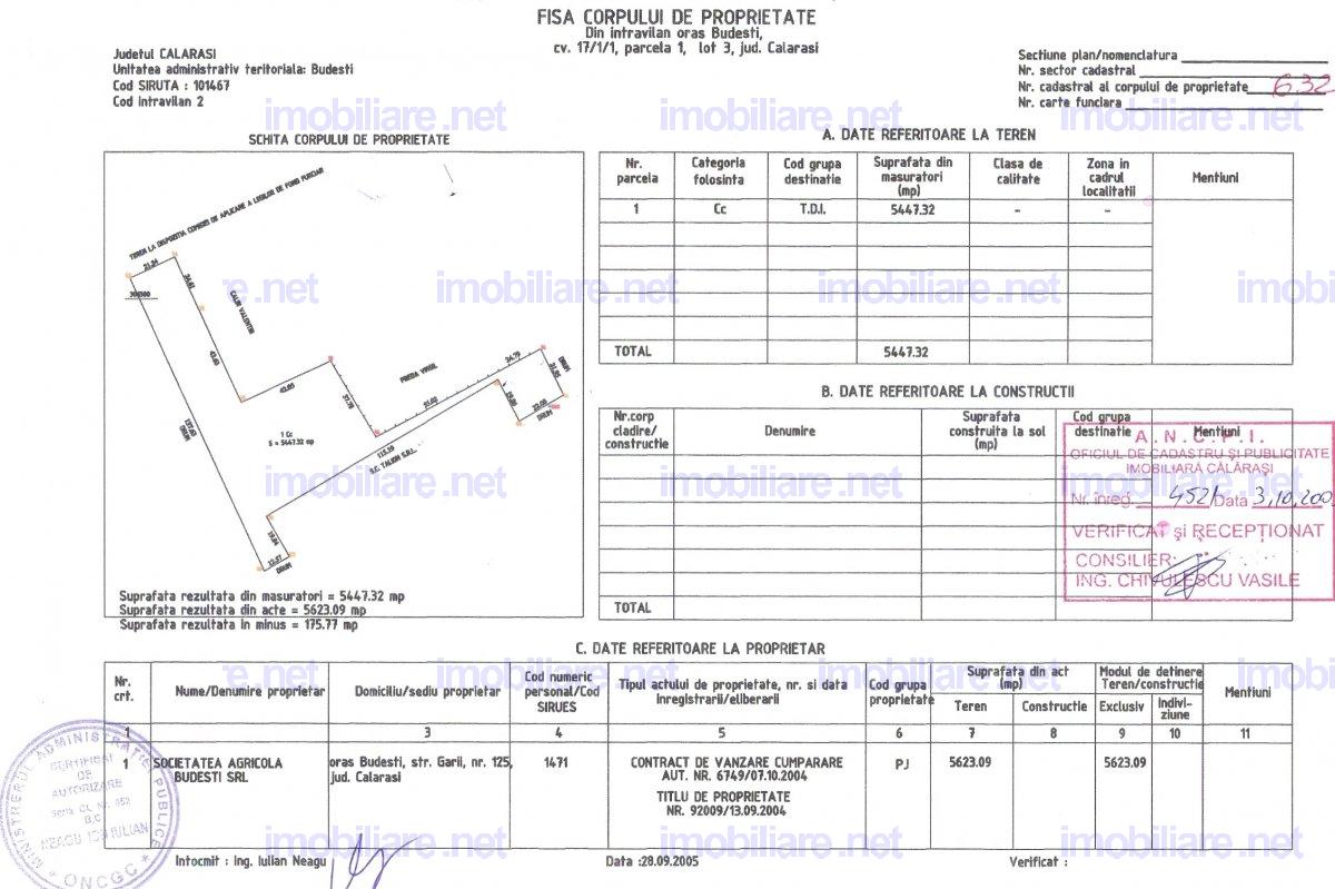 Budești, Județul Călărași, Strada Gării, teren în suprafaţă de 5.447 mp. Tip teren: intravilan curți-construcții( posibilitate transformare în teren intravilan agricol) Front stradal: 21,95 m. Deschideri de 157,43 m, 12,57 m și 22,06 m la drumurile perpendiculare. Preț 49.000 EUR. Telefon/WhatsApp: 0740 244 795, 0745 988 925.