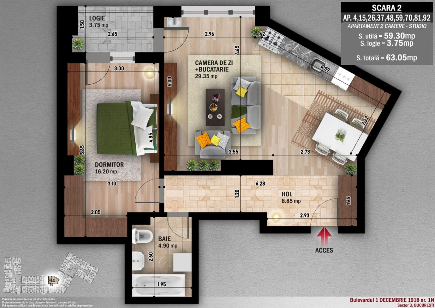 Etaj 1 / 8, suprafata totala 63 mp (balcon inclus)