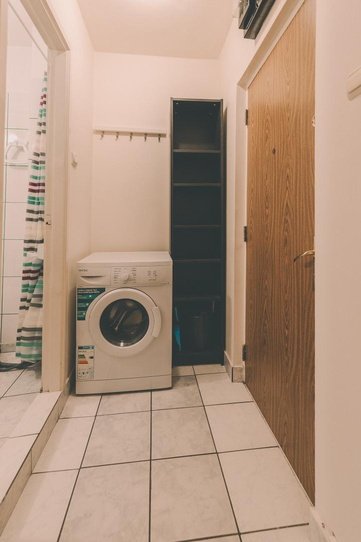 bucatarie mobilata si utilata cu aragaz, frigider si masina de spalat rufe