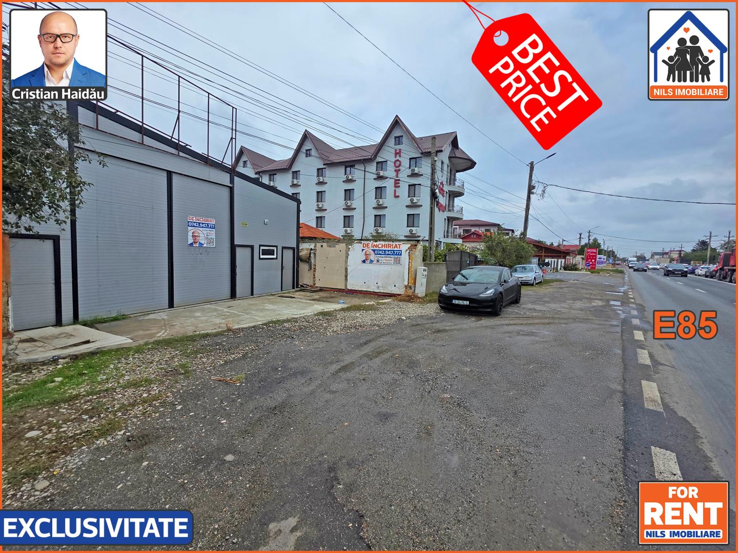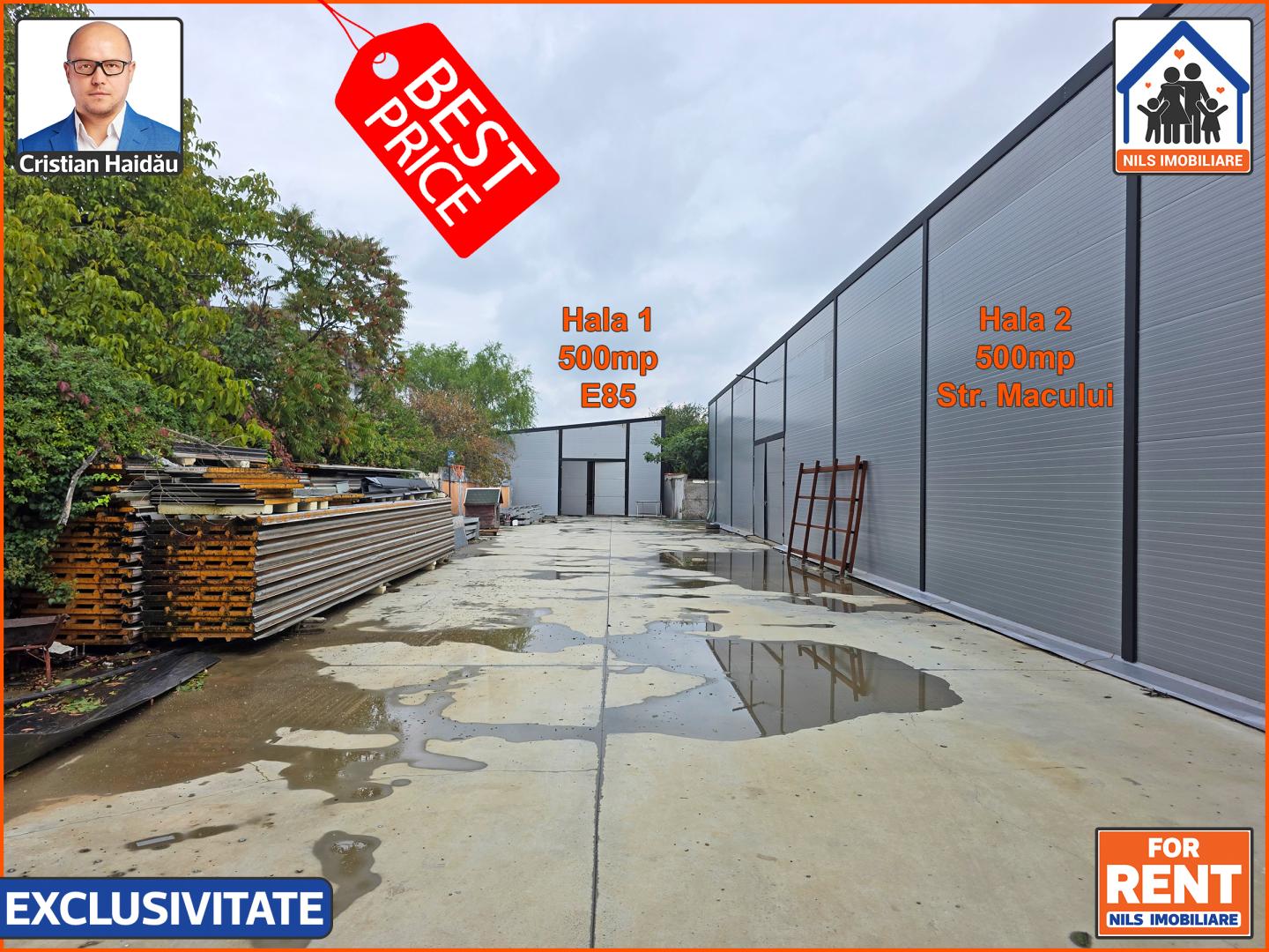 Ambele hale se inchiriaza cu 3250euro dar exista si posibilitatea inchirierii separate. Hala de la E85 se inchiriaza cu 3,8euro/mp = 1900euro iara hala din spate cu deschidere la strada Macului cu 3,2euro/mp = 1600 euro. Se adauga TVA. /