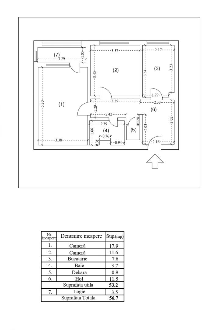 - Suprafata totala: 57 mp, suprafata utila: 53 mp
