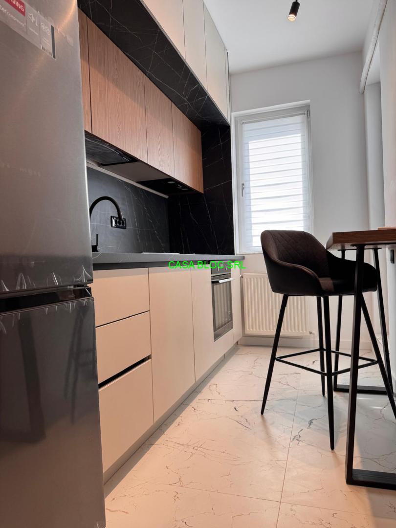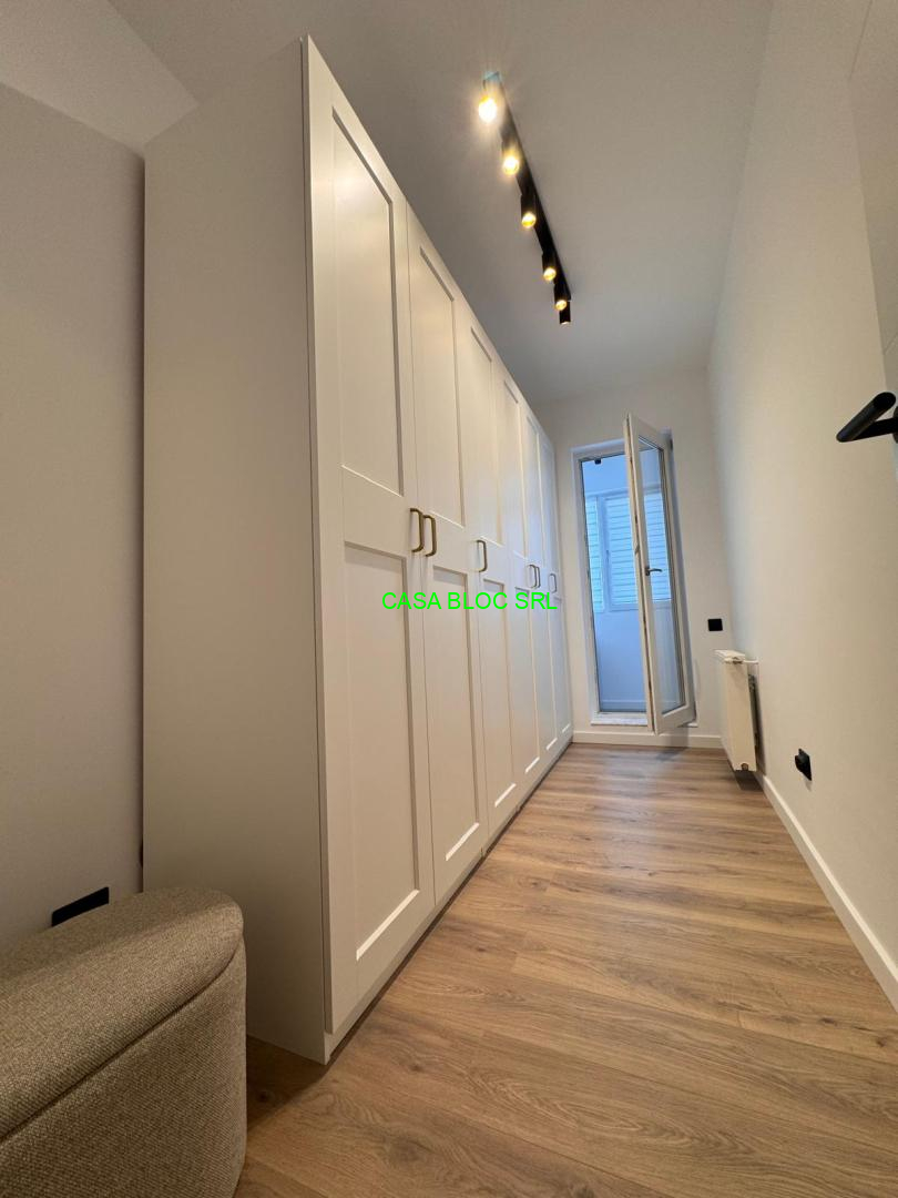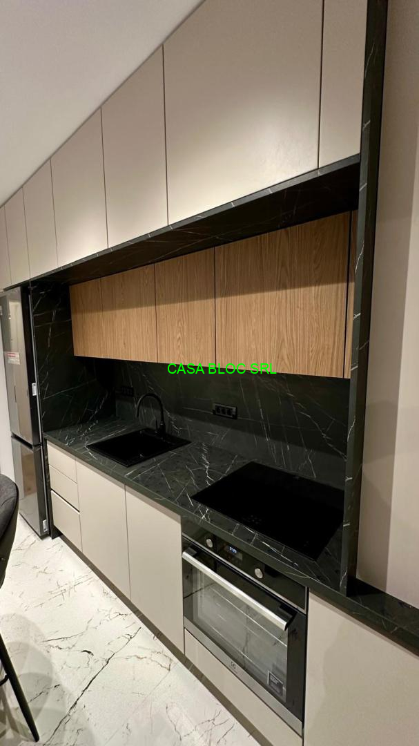 *bucătărie inchisa (camera cu usa), mobilata modern cu mobilier complet integrat cromatic, facut pe comanda preponderent din MDF vopsit, blat si contrablat calitate premium, dotata cu electrcasnice - modele actuale de cea mai buna calitate (masina de spalat vase Whirlpool WSIO3T223PCEX, hota Eletrolux LFG716R, combina frigorifica total No Frost LG GBV7270DEV, cuptor incorporabil Electrolux EOD6P66X cu autocuratare pirolitica, SteamBake, Grill, Timer, etc., plita cu inductie incorporabila Electrolux LIL61434C cu 4 zone de gatit, conectivitate automata cu hota Electrolux);