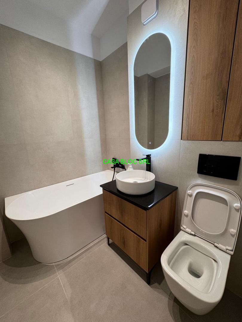 *2 bai hidroizolate, dotate complet cu obiecte sanitare, cada freestanding din acril sanitar premium, respectiv cabina de dus Radaway, lavoar pe blat din granit negru rezistent la umiditate si masca, oglinzi cu banda smart led, functie dezaburire integrata aferenta unui model, toalete incadrate modern, suspendate, model Ideal Standard - Rimless, masina de spalat rufe Samsung 9 kg, WW90T534DAWCS7;