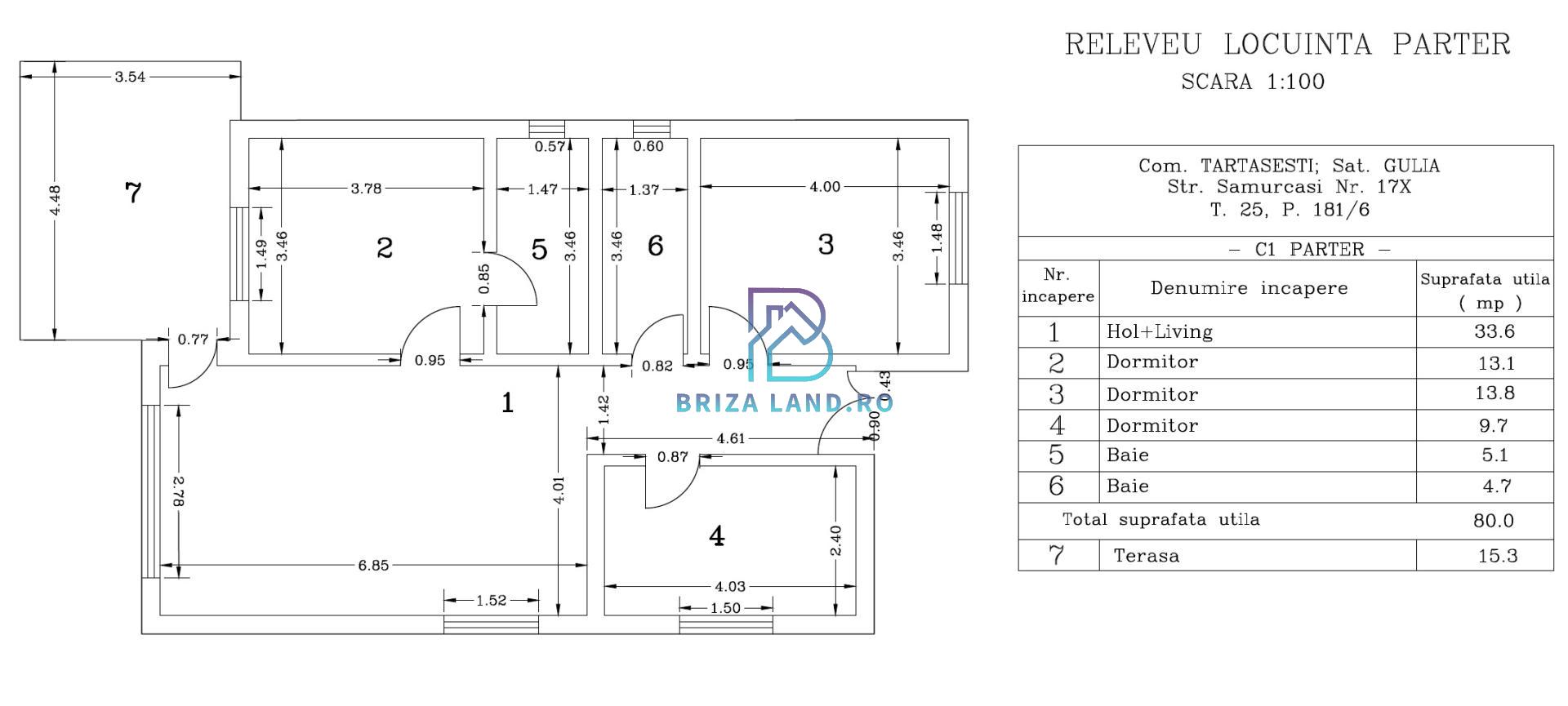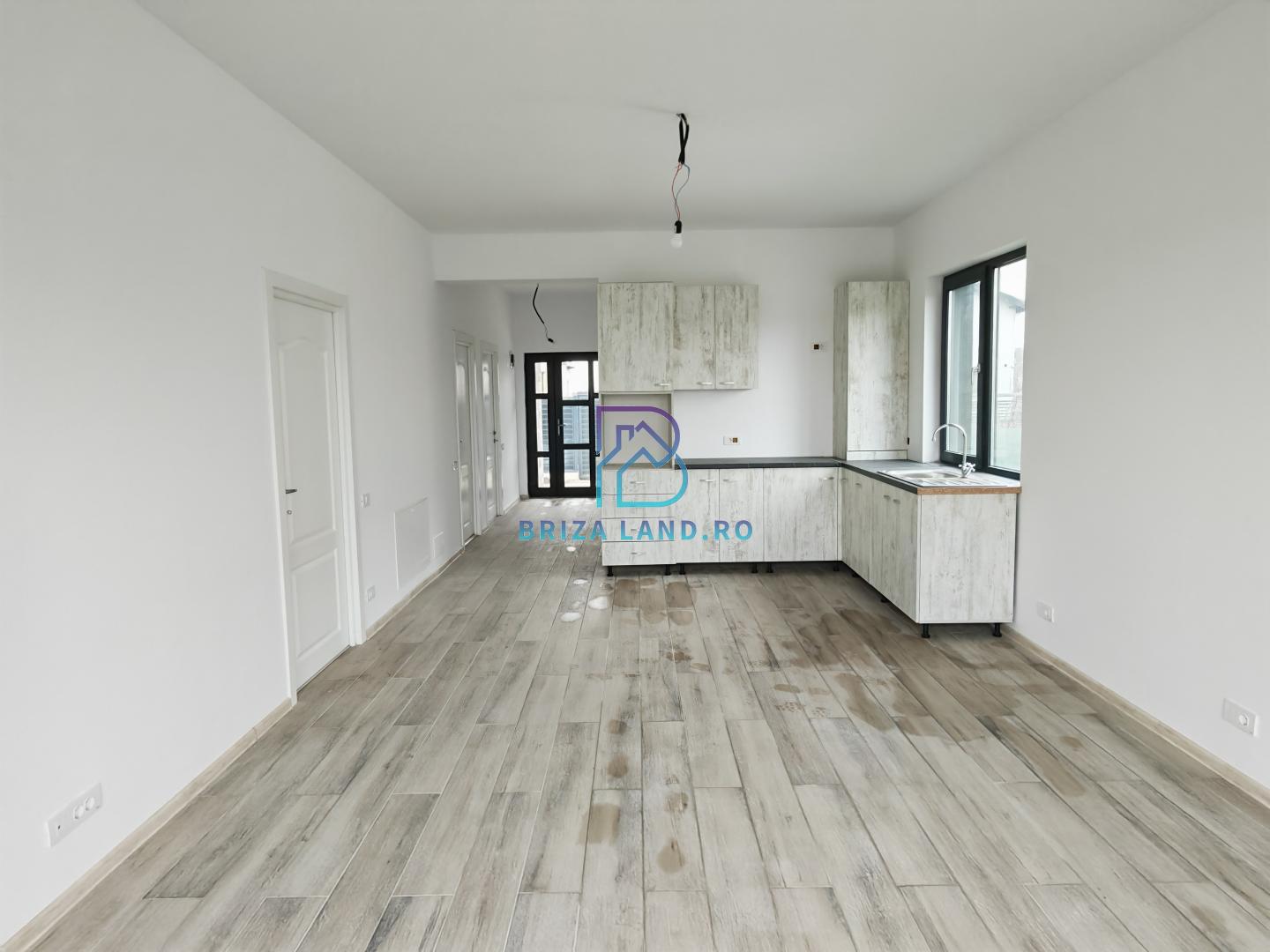 terasa intrare, hol, living cu bucatarie deschisa si iesire pe terasa, 3 camere, doua ba, terasa;